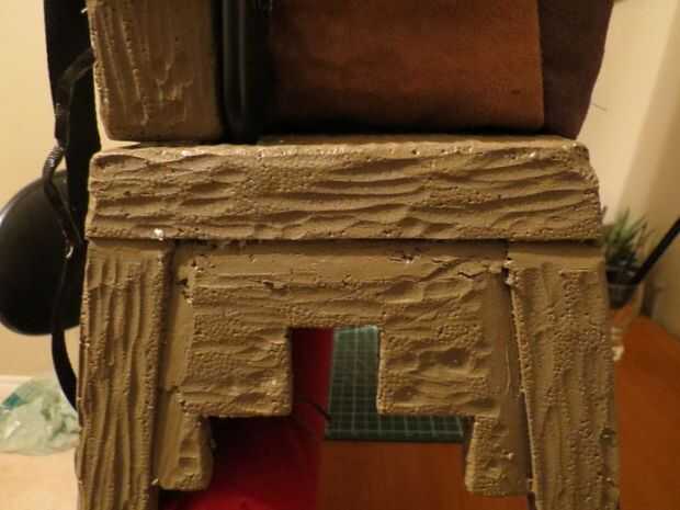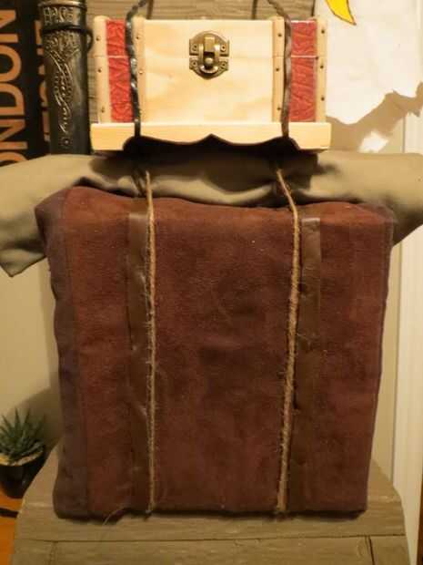 Tome la caja mediana, cubrir con alguna tela áspera medievalish o cuero y correa de la tapa con una cuerda a través de orificios perforados.