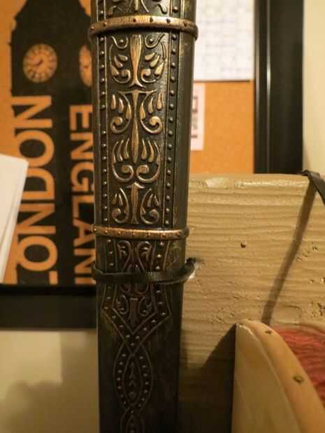 La espada estaba simplemente atada en con tiras de cuero a través de agujeros en la tapa.