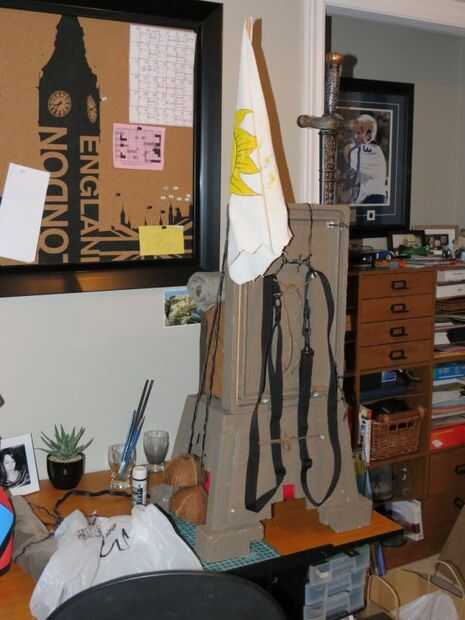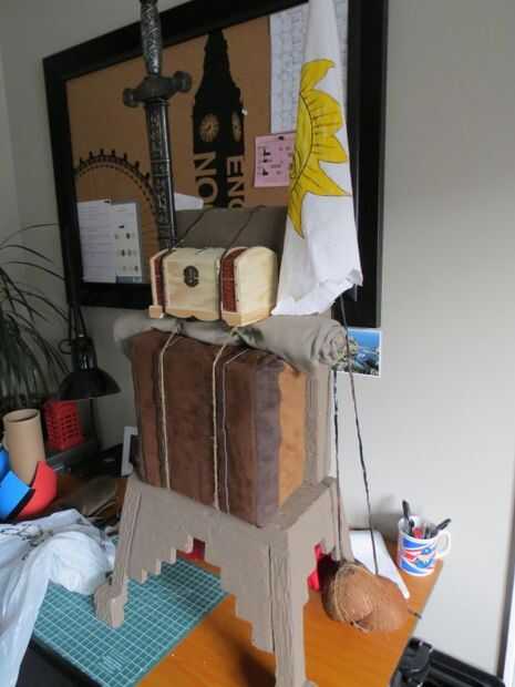 El asta de la bandera pasa por un lado (perforaciones en la tapa y base) y encolar o pegar con cinta adhesiva.