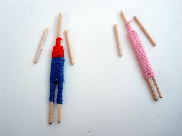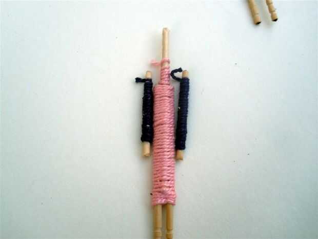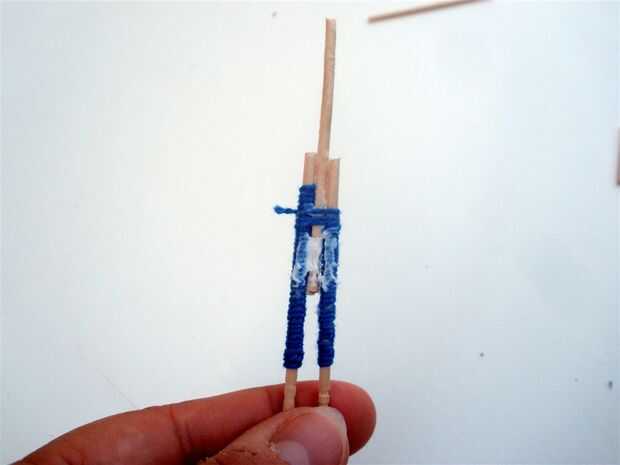 Envuelva el hilo de color de pantalón en todos tres palillos de dientes, que cubre la parte inferior del palo medio. Parar en un punto donde comenzará la camisa.