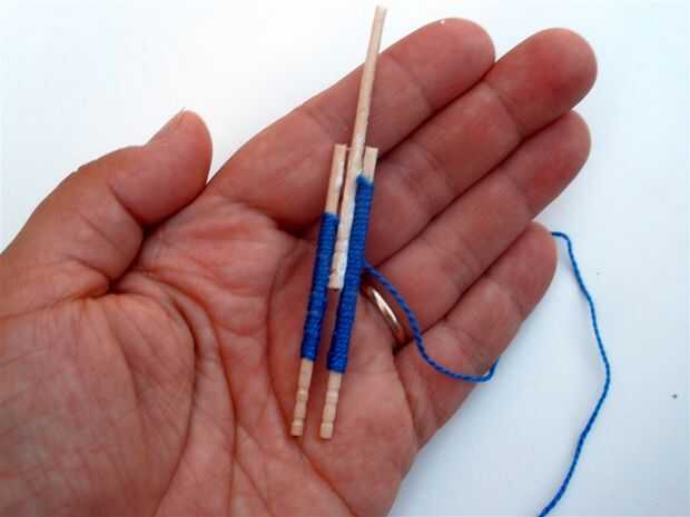 Rodar el hilo a lo largo de los palillos dentro de un 1/2-pulgada de la parte superior. Repetir en un segundo palillo.