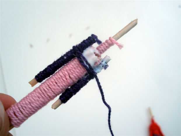 A partir de cerca de la parte inferior de los tres palillos de dientes, envuelva la rosca "vestido color" alrededor de los tres palillos de dientes para el vestido, punto pegado según sea necesario para la parte superior de la pierna.
