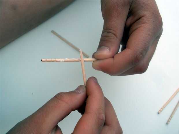 Pegue un tercer palillo de dientes entre los dos palillos de dientes, sobre a medio camino para arriba, que tenga la cadena "bragas color" de ellos.