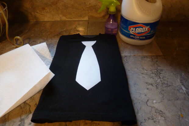 Preparar una solución de blanqueador y agua 50/50 en una botella de spray.  Prueba el spray en el fregadero.  Prefiero un spray suave agradable en una secuencia.  Ajustar la boquilla de la botella según sea necesario para conseguir un buen spray.  Colocar algo dentro de su camisa (yo uso una tabla de cortar) y camisa alrededor de él para proteger áreas que no desea obtener cloro.  Rociar con la solución de lejía y dab rápidamente la parte de atar con toallas de papel para que no empape el blanqueador a través del papel de congelador.