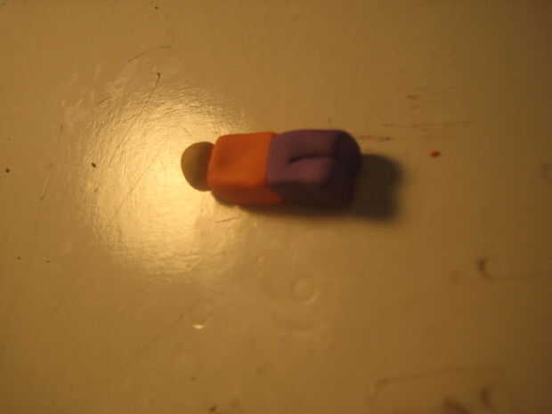 Rollo de una sola pieza de tan (o cualquier color) en una bola.  Luego forma la naranja en un bloque y la púrpura del rodillo.  Doble la púrpura y sujete las tres piezas juntas.  Rodar las piezas restantes de bronceado y agregarlos como armas.  Personalizar como se desee.