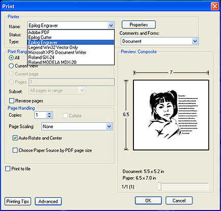 Al llegar a la pantalla de impresión seleccionar haga clic en "Nombre" y luego desplácese hacia abajo para láser de Epilog. Esto le llevará a una pantalla separada para el paso 6!