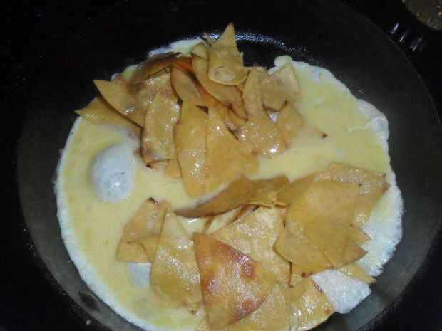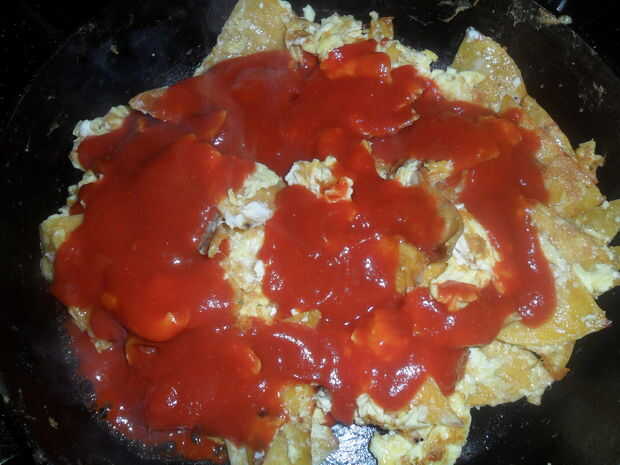 Calentar el aceite en tu sartén (uso canola o aceite vegetal) sobre fuego medio alto. Apilar tus tortillas uno encima del otro, su fiel cuchillo y cortar en triángulos. Una vez que el aceite esté caliente, añadir tus tortillas en 2 turnos. No la muchedumbre su bandeja porque quieres las tortillas para conseguir un poco crujiente. Cambio de tortilla, una vuelta en la sartén con el cambio de tortilla dos y añadir los huevos. Revolver los huevos alrededor de para cocinar, condimentar con un poco de sal, bajar el fuego a medio bajo. Añadir la lata de salsa El Pato y revuelva, cubriendo los huevos y tortillas. Apague la estufa. Añadir como mucho queso rallado como te gusta y revuelva hasta que el queso se derrita. Placa para arriba, agarrar un tenedor, decir sus gracias y cavar! Comer feliz!