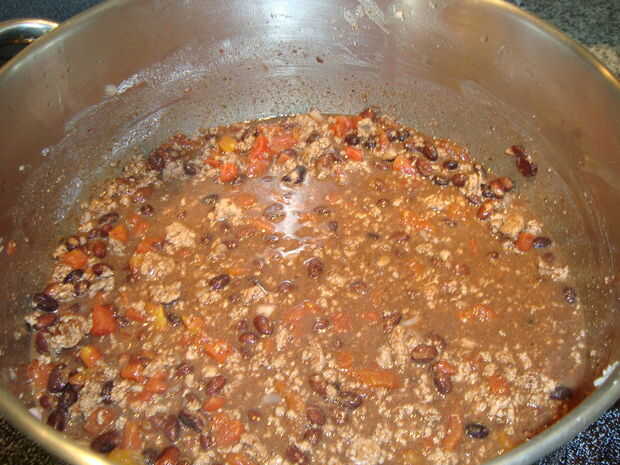 Nos desplazamos a la parte principal del plato, la carne de búfalo. Añadir una libra de búfalo a la olla grande, con una pequeña cantidad de aceite de oliva. Cuando empiece a dorarse, trocear la cebolla y el ajo. Continuación, agréguelos a la carne del dorado. Luego abrir sus latas de sopa de frijol negro y tomates. Y agregarlos a la olla también. Si prefiere el Chile un poco más fino, añadimos una taza de caldo de pollo.