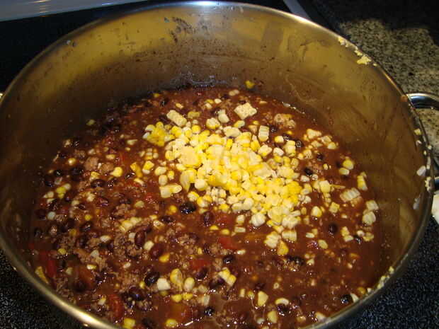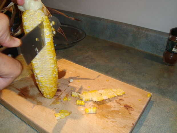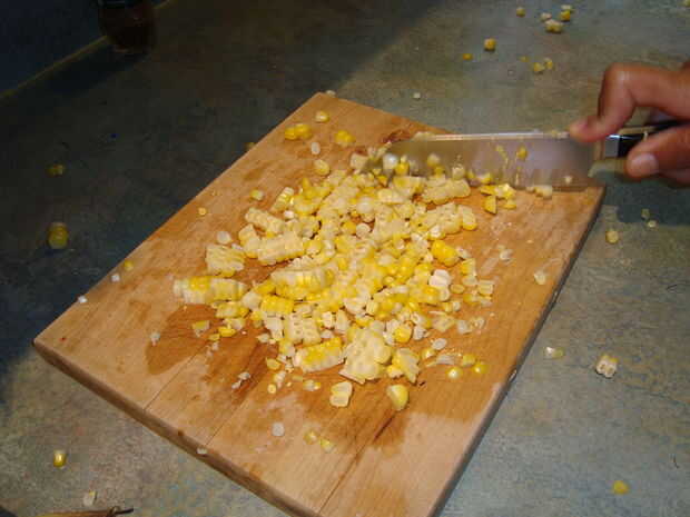 Ahora con el maíz tostado, comenzar cortando los granos de la mazorca, tenga cuidado con ese cuchillo! Luego tomar las pepitas y cortarlas, así que no palillo todos juntos en una pila de maíz grande. Y por último añadir el maíz a la olla y mezclar. Ahora que este fuego lento durante unos 15 minutos.