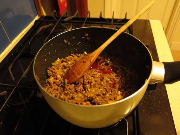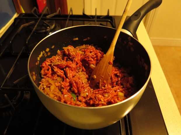 Una vez la cebolla y las verduras se ablandan y comenzado a dar vuelta a marrón ligeramente es tiempo de añadir la carne picada, una vez que la carne esté cocinada le tendrá mucha grasa que ha soltado en el plato y se cuece en la sartén. Tiendo a dejarlo en hasta servir. la grasa añade mucho sabor al plato y desea tanto el sabor en el plato antes de retirarlo.