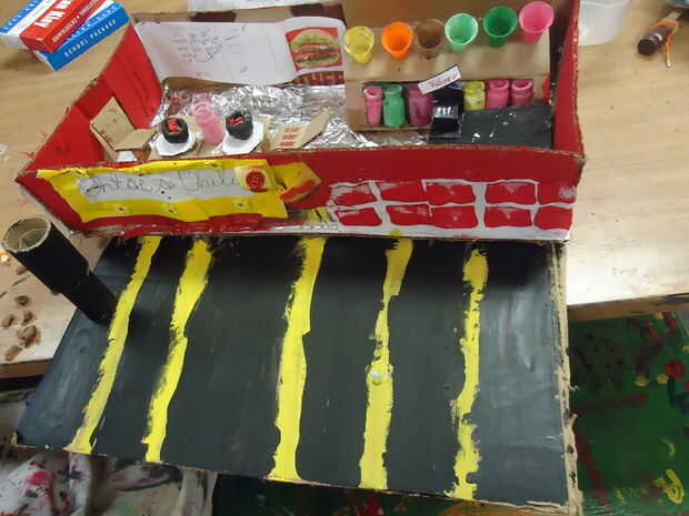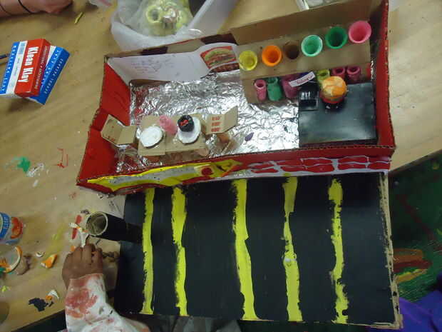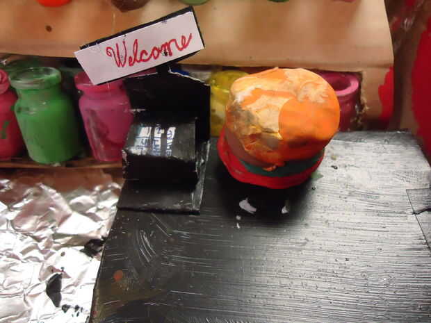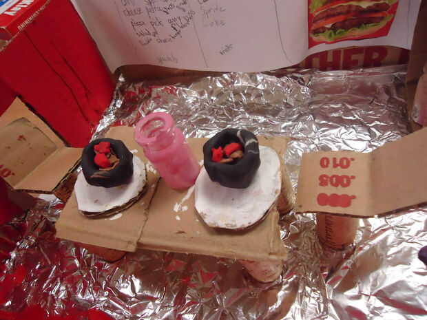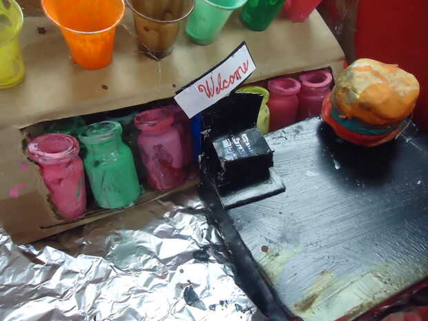 Usé cartulina para la mayor parte de él. También usé botellas mini, revistas viejas, papel de aluminio y arcilla. Fue difícil conseguir las piezas de cartón exactamente el tamaño correcto. Construí la caja de mí mismo también, y era difícil conseguir las piezas que encajan entre sí y que incluso en la parte superior.