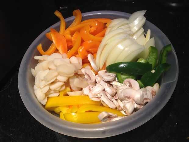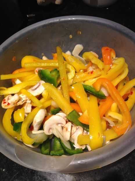 A continuación cortar todas mis verduras y luego brevemente los marinados en ají así.
