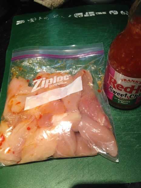Lo primero que hice fue limpiar y trocear mi pollo en trozos más pequeños para que se cocine más rápido. Una vez que las piezas se cortaron para arriba, puse un plástico holgado y vierte algunos de salsa de Chile en la bolsa para adobar. Había marinado el pollo en la nevera durante unos 30 minutos, pero se puede hacer ya.
