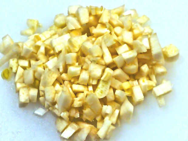 En una tabla de cortar, trocear finamente el ajo. Agregar a la mezcla de tomate.
