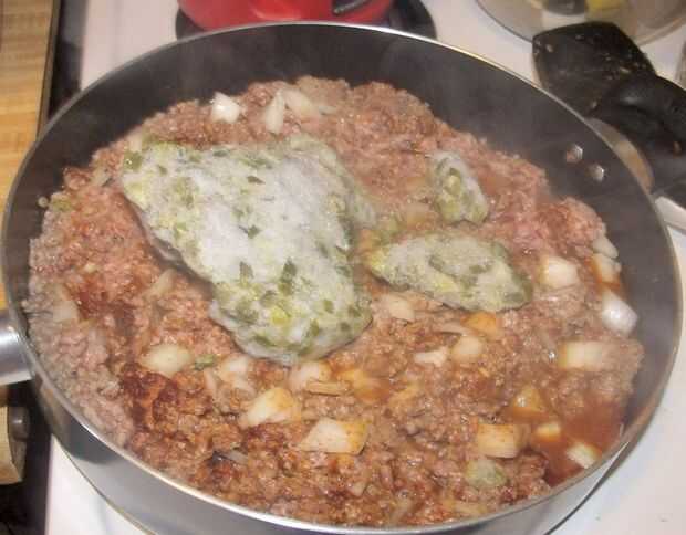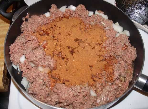 cocine la mezcla sobre fuego medio alto hasta que la carne ha perdido su color rosado y luego colar cualquier grasa y vierta en un crockpot (si usted no tiene un crockpot conseguir uno pero puedes cocinar esto completamente en una sartén grande, justo a la forma de calor hacia abajo)