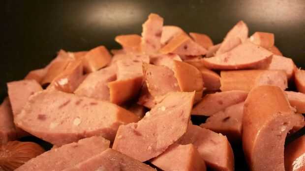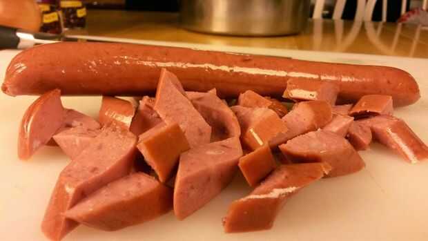 Hack para arriba de la salchicha en un sesgo y lanzarlas en una sartén hasta que se los bordes crujientes! Me gustan las minas bien hecho para que conserven cierta textura en el Chile!