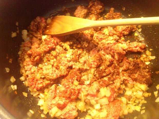 Añadir 1 libra de carne molida, 1 cucharada de Chile en polvo y aplastar en los 2 dientes de ajo con una prensa de ajo o agregar 1 cucharada de ajo en polvo y cocinar hasta que la carne se dore/completamente cocinada.