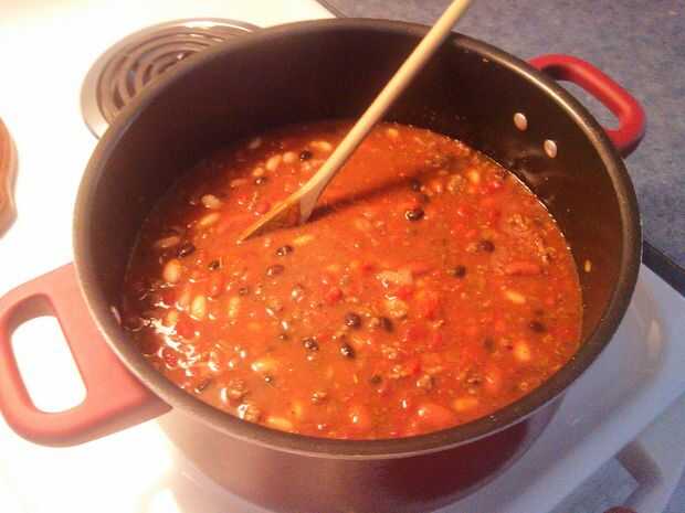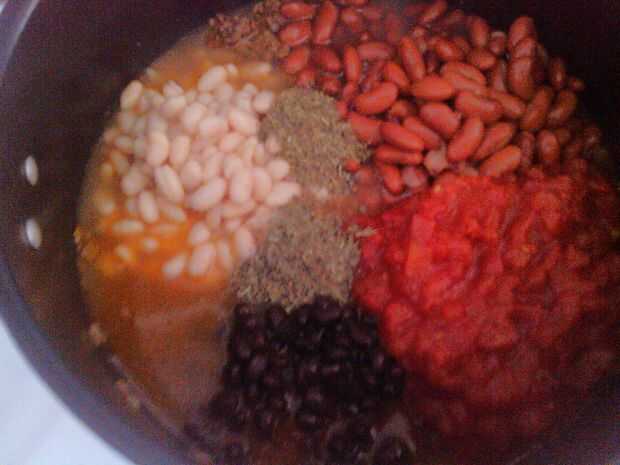 Añadir en el 4 latas de frijoles, 1 lata de tomates, 1 taza de salsa, 1 cucharadita de italiano de aderezo, 1 cucharadita de albahaca, 1 lata de salsa de tomate y el otro 1 cucharada de Chile en polvo.