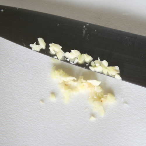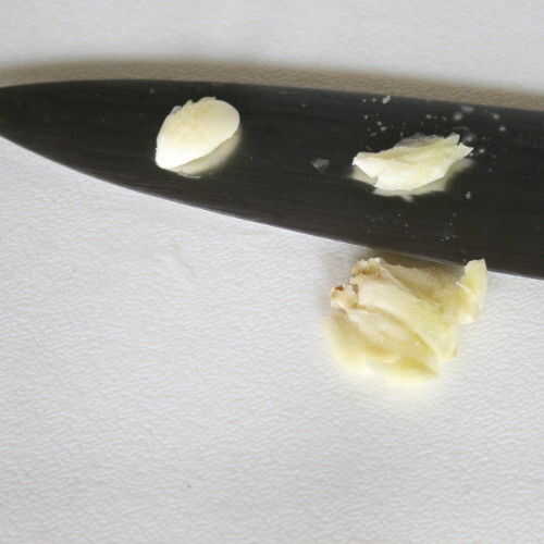 • Coloque el diente de ajo en la parte plana del cuchillo y golpear el cuchillo rápidamente con la culata de su mano.