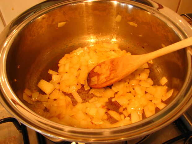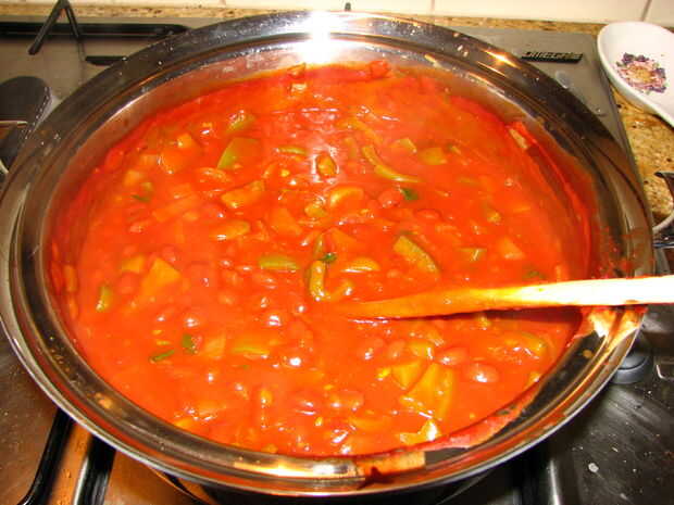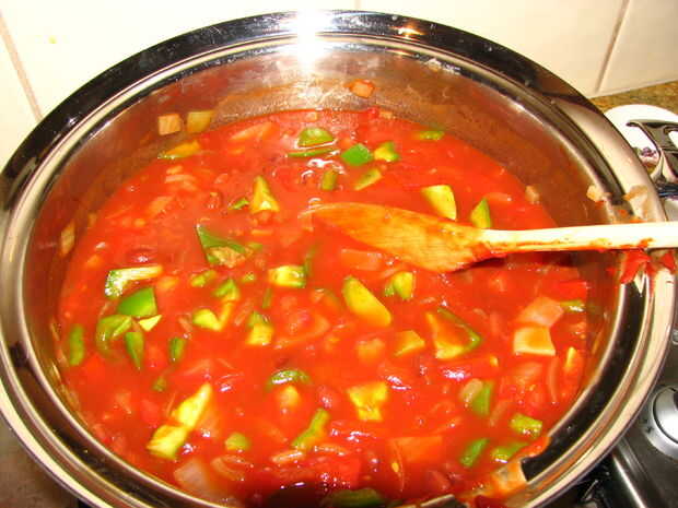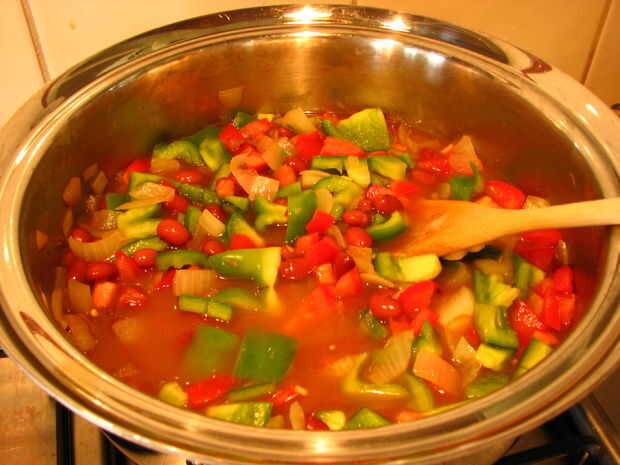 5: cocer durante unos 20 minutos a fuego medio, revolviendo con frecuencia para evitar los granos, verduras etc. de hundirse hasta el fondo y quema mientras el líquido se evapora en la parte superior. Cocer el Chile hasta que el color en el pimiento picado se vuelve aburrido. El pimiento y la cebolla cocina generalmente el más lento, pero que cocinado la cebolla previamente por lo que si se cuece el pimiento Chile está listo para servir.