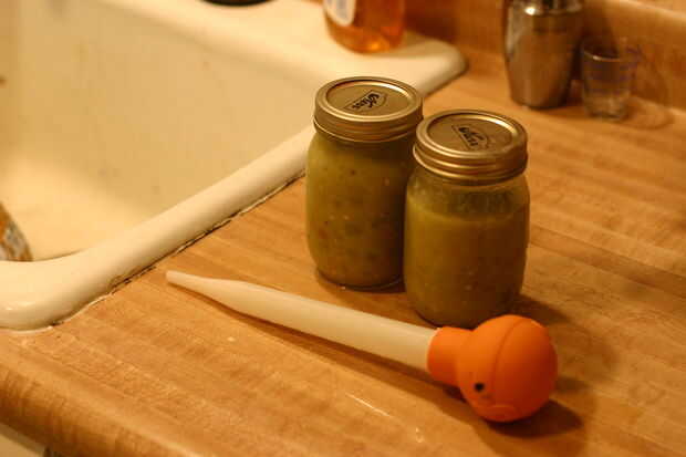 Luego, cuando haya terminado de inyectar el chile, proceder como lo haría con cualquier otra Turquía. Para nosotros, esto significó una salmuera durante la noche de 9 horas en 2 galones de agua, 1 taza de sal y 1 taza de azúcar para cada Turquía. Agregamos el chile sobrante a la salmuera, pero sólo porque tuvimos un par extras frascos en la nevera.