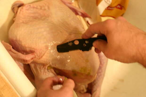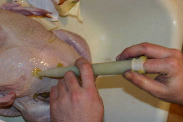 Si usted posee un inyector de sabor sólido Ronco, ahora es el momento de usarlo. Si no, puedes hacer lo que hicimos - utilice un cuchillo y una jeringuilla para pavo. Esto es idealmente una operación de dos personas y debe hacerse en un fregadero. El controlador de chile debe llenar el tubo de la jeringuilla para con chile verde y vuelva a colocar la bombilla en el desbastador. Agarre firmemente la base del bulbo forma un sello contra el tubo, de modo que apretando el bulbo obligará a chile a (cuando se suelta la bombilla, aflojar el sello, y el aire fluirá directamente a la bombilla de inflado, dejar chile verde en la punta de la jeringuilla para). Entonces el controlador de Turquía debe meter pequeños agujeros en el pavo con la punta de un cuchillo. No es necesario cortar profundamente en Turquía para depositar el chile de hecho, es mejor hacer un agujero justo lo suficientemente grande como para encajar la punta de la baster en la carne del pavo y luego empuje hacia abajo en la musculatura de las aves con la punta de la jeringuilla para. Luego simplemente apriete para inyectar el chile. Usted puede tener a mover la punta de la jeringuilla para hacia adelante y hacia atrás, o arriba y abajo, para la chile a salir. Asegúrese de que la chile es terminar en la carne, en lugar de agrupación de debajo de la piel.