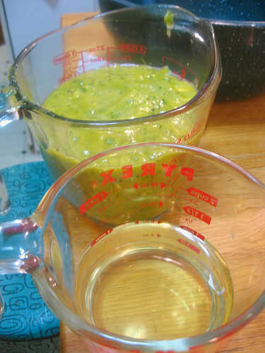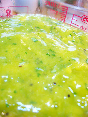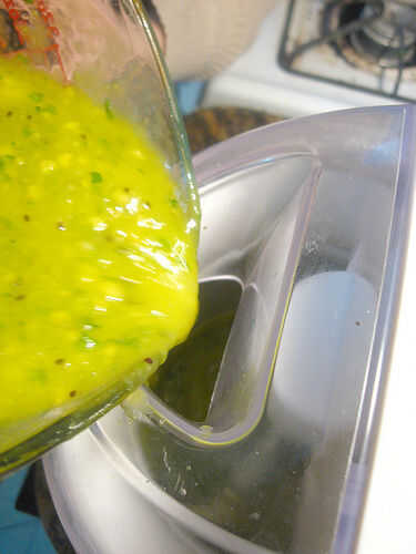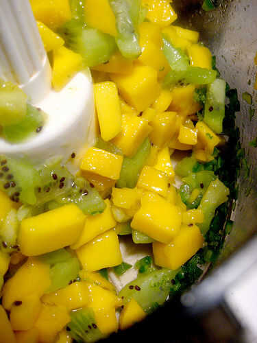 Para el sorbete de Mango Salsa, hice hasta una salsa de mango de mangos, kiwi, cebolla, jalapeños, jugo de limón, cilantro picado y sal. Hecho puré y luego siguiendo una receta de sorbete general, poner ese tipo de cosas en una heladora.
