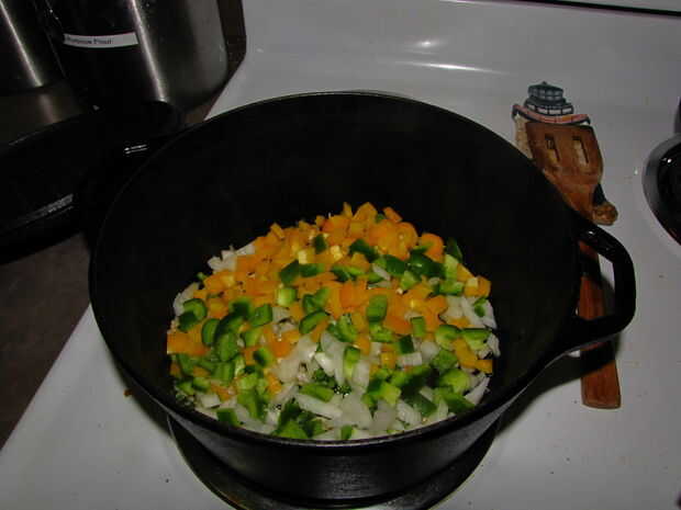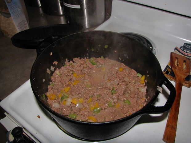 Calentar una olla grande de hierro fundido a fuego medio hasta que caliente. Añadir aceite, pimientos, cebollas, ajo y pimientos jalapeños hasta que estén transparentes, unos 8 minutos. Añadir la carne de venado en cubos y tirada de tierra y cocinar por unos 5-8 minutos. Cuando la carne está cocida agregar los tomates, Chile en polvo, comino molido, Cayena de tierra, salsa de Worchestershire, vinagre de vino tinto, sal y pimienta.