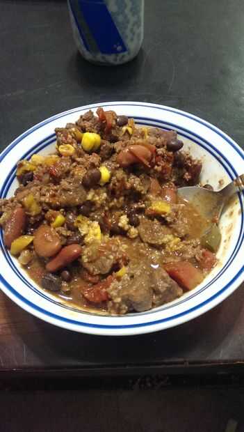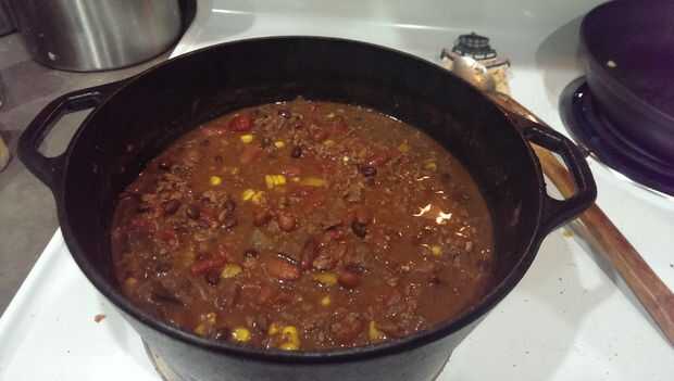 Poner la mezcla a hervir, luego reducir a fuego lento. Añadir las habas y cocinar durante 30 minutos. Ahora agregue el maíz asado al fuego y cocine por otros 15 minutos, cubierto. Verifique el sabor y añadir especias si es necesario. Para un Chile más caliente (picante), añadir su favorito salsa picante al gusto. Servir sobre arroz o un caramelo, pan de maíz. ¡ Disfrute!
