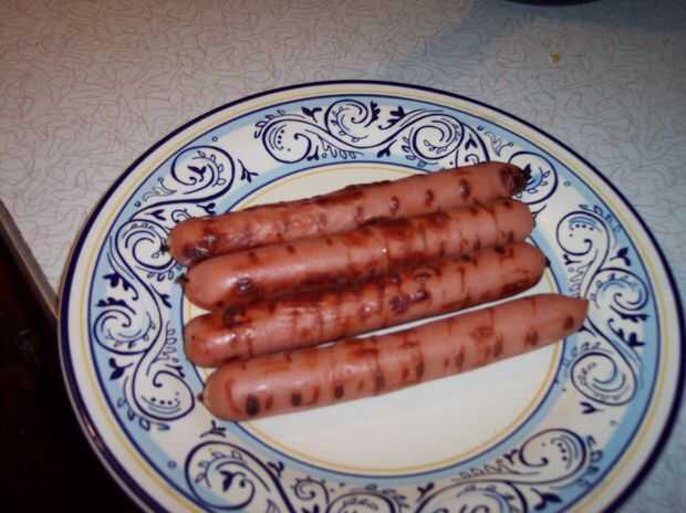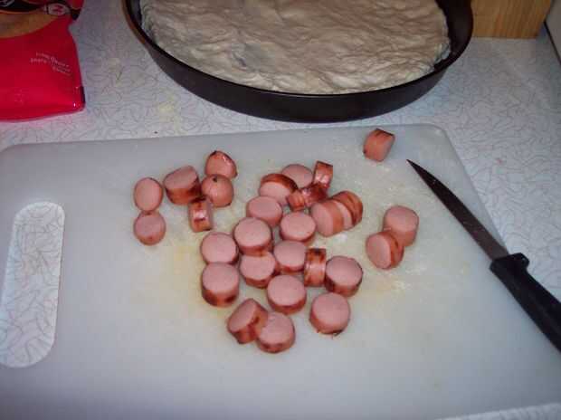 Cortar las salchichas en trozos gruesos de 1/4"- 1/2". Terminé usando unos 2,5 salchichas. Era perfecto para 1 pieza en cada picadura de 1-2 de pizza. Usted podría hacer más o menos a gusto.