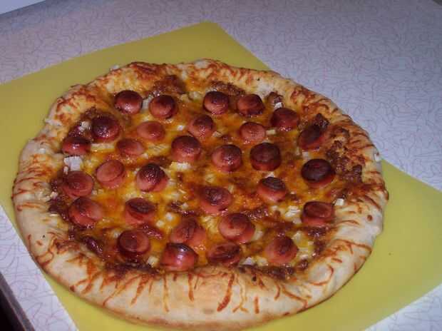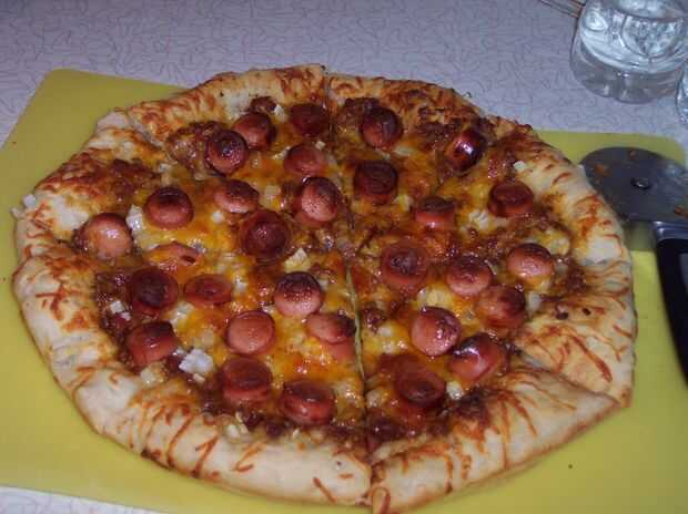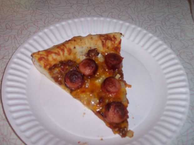Hornea la pizza durante 15-20 minutos. Normalmente cuando hago pizza, tarda unos 20 minutos pero fue más rápido esta vez. Creo que fue porque los perros calientes y Chile eran calientes para comenzar con. Girar la pizza 1/2 parte de la cocción para incluso para hornear.
