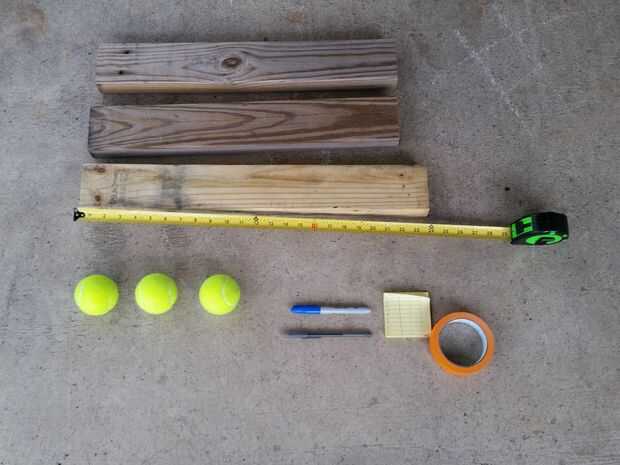 1) 3 "x 3" Bloc de notas (ayuda para la medida de la rejilla y una hoja de puntuación) 2) cinta adhesiva (1" amplia muestra/usada) 3) medir (medida de cinta utilizadas se muestra) 4) 3 pelotas de tenis 5) instrumento escribir (pluma y marcador se muestra/usado) 6) 3 2 x 4 madera. 2 @ 22", 1 @ 24".