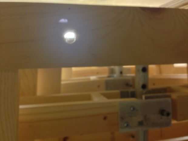 Para esto hice separadores para evitar que los paneles de palanca recorte unos a otros como se movían hacia adelante y hacia atrás. Son simples 3" plazas del 1" pino que estaba usando para todo lo demás. 24 piezas en total. 4 para cada esquina de cada conexión de pared a pared. Taladre un agujero de ½" en el centro de cada uno y perfore un agujero correspondiente en las paredes de cada sección que desea conectar.