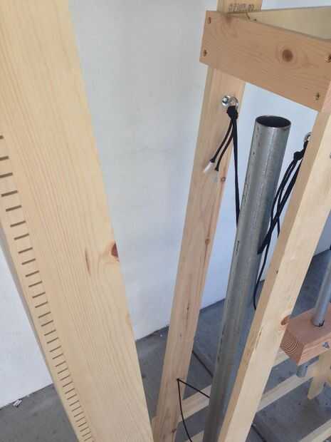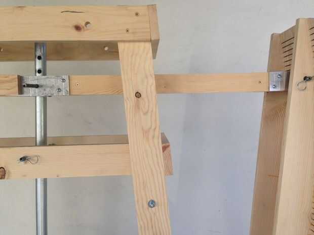 Este marco fue construido con dos paredes correspondientes. Cada pared del marco es 36" en la base, 78" de altura, 24" de ancho en la parte superior. Estas paredes están separadas por 12" barras transversales. Cada bastidor está construido para que pueda ser empernado a la siguiente.