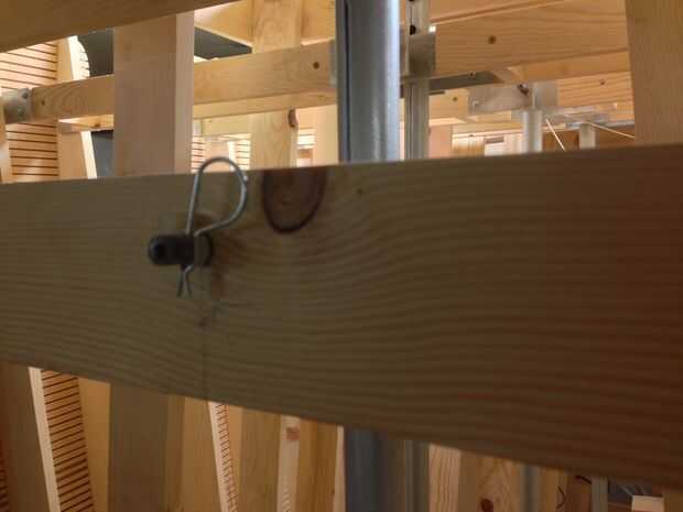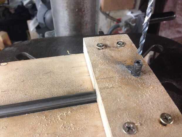 Revisar a la guía de perforación material redondo de BeachsideHank. Los agujeros de que taladro en estos tubos son para que los pasadores de enganche sostenerlas en lugar. La colocación de los agujeros puede variar según lo que usted quiere. Me pareció mejor darles lo suficientemente cerca a la más cercana de la pared de madera para mantenerlos en su lugar y permitir que un pequeño bamboleo.