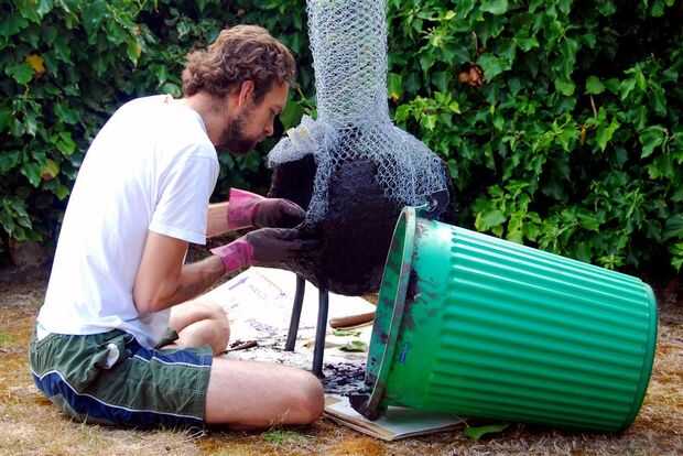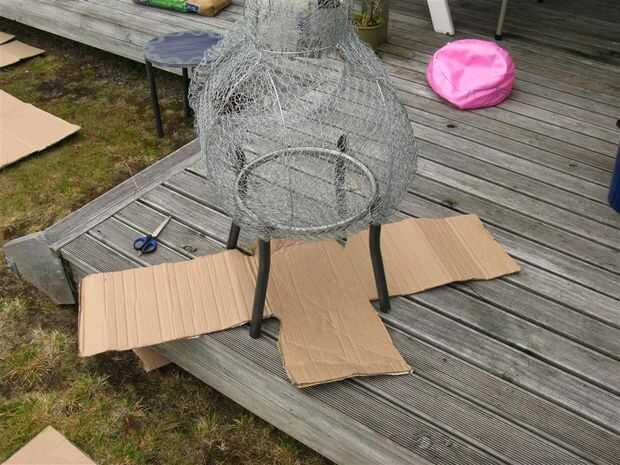 Puede que necesite algún apoyo en la parte inferior para evitar que el cemento caiga hacia fuera. Aunque inicialmente palillos puede caerse después de media hora mientras usted no está buscando. He doblado algunos cartulina alrededor de la parte inferior y luego envuelto todo en plástico.