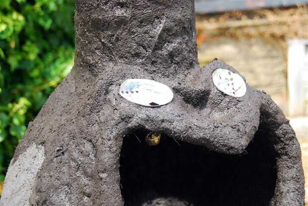 Hice tomas especiales para los ojos y alrededor de la base de la chimenea escayola una capa gruesa de cemento en el que apreto una fila de fragmentos de cáscara.