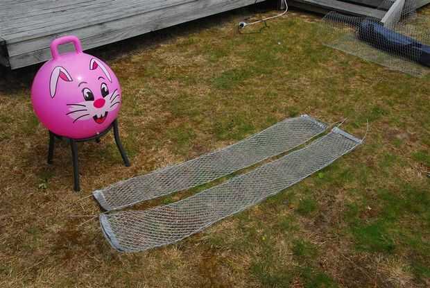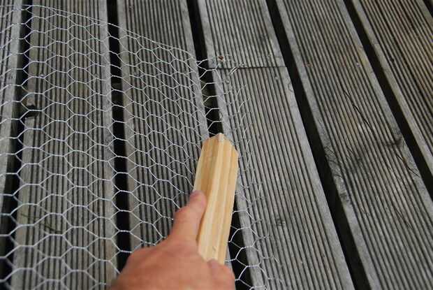 Para obtener el espesor extra, fui a través de un procedimiento que me gustaría llamar "Esponjar el alambre de pollo" (patente pendiente). Pongo el alambre del pollo hacia abajo en nuestra terraza de madera que tiene estrechos huecos entre las tablas y me encontré un pedazo de madera sobre el alambre de pollo, introduciendo en los huecos. Luego doblé el alambre de pollo hacia atrás dos veces para que la parte superior de las crestas se reunió. Esto me dio un buen grosor.