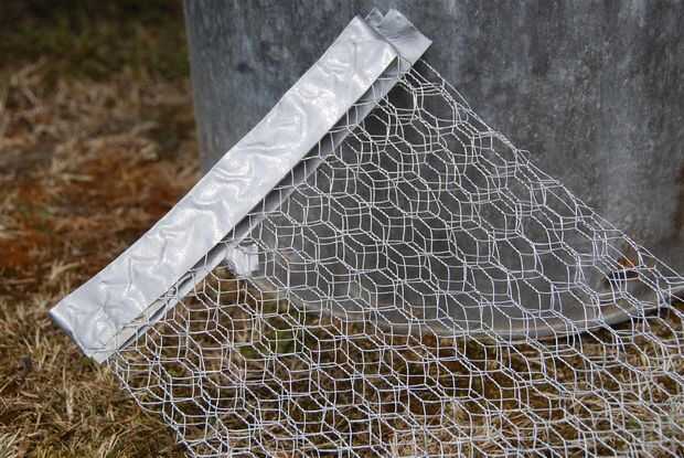La documentación sobre ferrocemento encontré en la web sugerida para utilizar por lo menos 5 capas de alambre de pollo pero la distancia entre las patas de la estructura fue exactamente 22, 5cm así que doblé el alambre de pollo ancho 90cm 4 veces.
