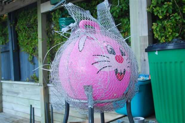 Puede crear su esfera (o cilindro) por separado y descansar en un marco cuando el cemento es curado. Creo que podría ir para un cilindro la próxima vez como rellenar los huecos y tratando de conseguir que una verdadera forma redonda era desafiante con el marco en su lugar.