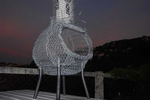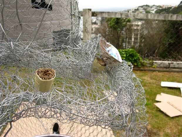 Para que alguna luz brille sus ojos presentó dos piezas de cartón envuelto en la malla de alambre directamente detrás de los agujeros en las conchas. De esta manera puedo embalar en el cemento y mantener una apertura que irá hacia el fuego.