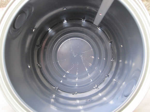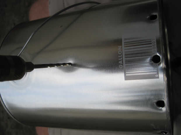 A mitad de la altura de la lata, perforé los agujeros que los cables de separación se rosca a través de. Ya que quería que los agujeros para ser directamente enfrente de uno al otro en la lata, divide la circunferencia de la lata en cuartos y octavos. Al igual que en el paso anterior, presentar por los restos afilados de la perforación.