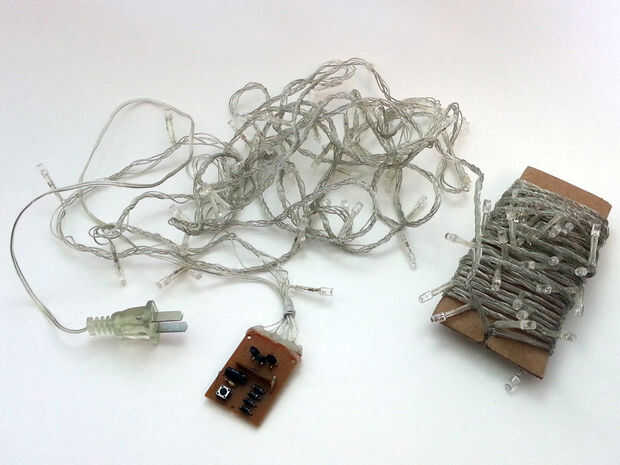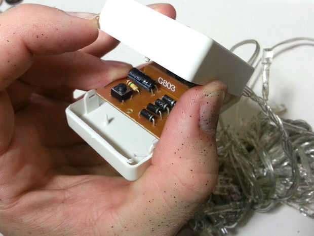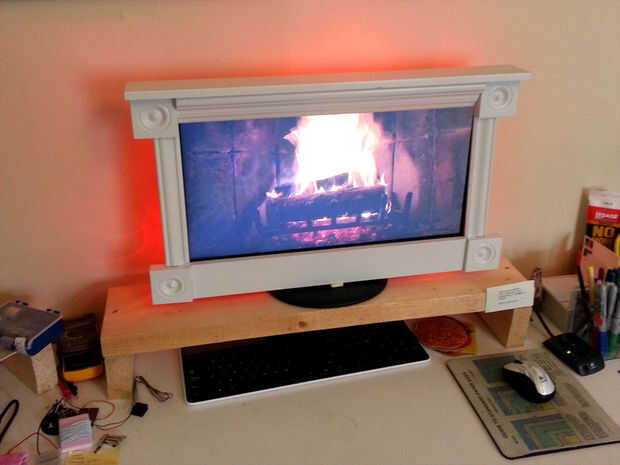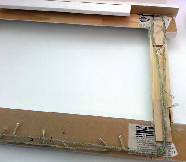 Aunque este cuadro era pequeño, el recinto era un poco demasiado grande para mi gusto, así que quité la tarjeta de circuitos del recinto para reducir volumen. La caja de control fue montada en la parte posterior de la pieza de manto en un área vacía en el monitor. Los hilos de LED eran entonces caliente pegado alrededor de la parte posterior del marco. Exceso filamentos de LED fueron reunidos y envuelto alrededor de un trozo de cartón para mantenerlos todos juntos. Este paquete se oculta detrás del monitor una vez que se instaló el marco.