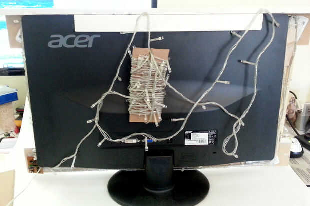 El marco entonces fue instalado en el monitor y el enchufe de las luces fue alimentado detrás del escritorio y enchufado.