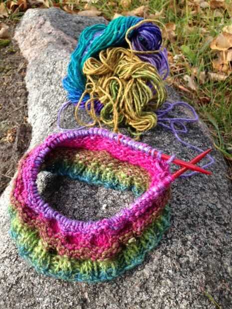 Después de la primera pulgada o tan de punto que nos damos cuenta de la lana que estamos usando es embotado (azules y verdes) por lo que comprar una nueva madeja de lana con colores más brillantes, atarla en y continuar el tejido con el colorway rosa.