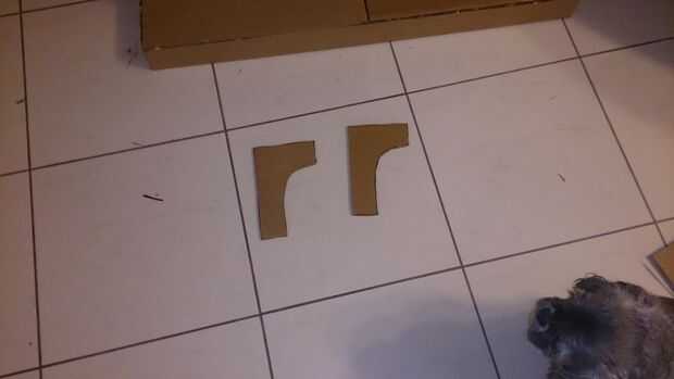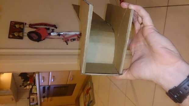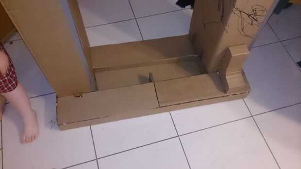 Para acceder más fácilmente a la parte inferior de la repisa, puse la estructura en su parte posterior. Utilizando trozos de cartón de dos capas cortado y pegado un marco básico, ver en la imagen para añadir fuerza y apoyar así la chimenea podría sostener algo de peso y no la hebilla.