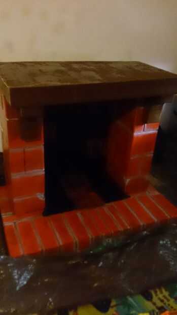 La pintura fue realizada por mi esposa, y creo que ella hizo un trabajo fantástico! Llegué a casa de trabajo y esto me dejó casi a! Marrón para la chimenea y aplique apoya, porque son "madera", rojo para los ladrillos y gris para las lagunas de "mortero". Incluso hizo un efecto roughed para arriba/quemado con negro y rojo para el interior!