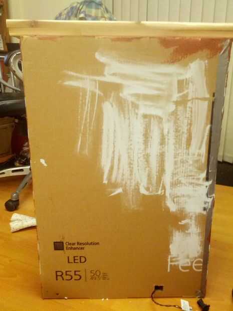 - Corte una caja en la forma de su chimenea. Se puede ver que utilicé una vieja caja de TV. Corte una forma de chimenea de la parte delantera y crear una base para el hogar.
