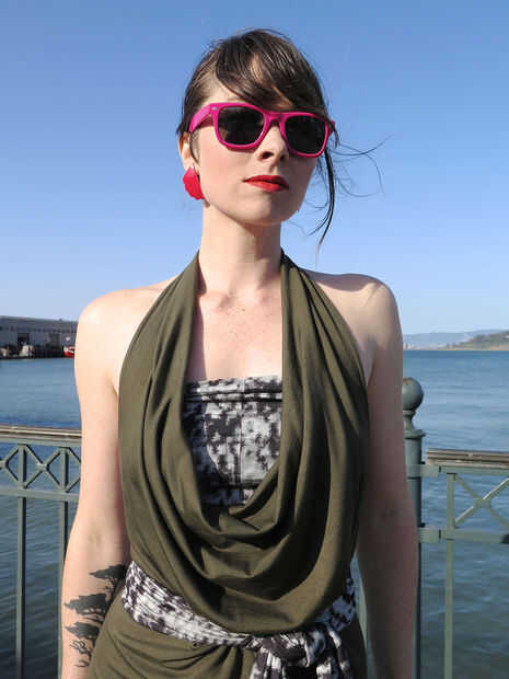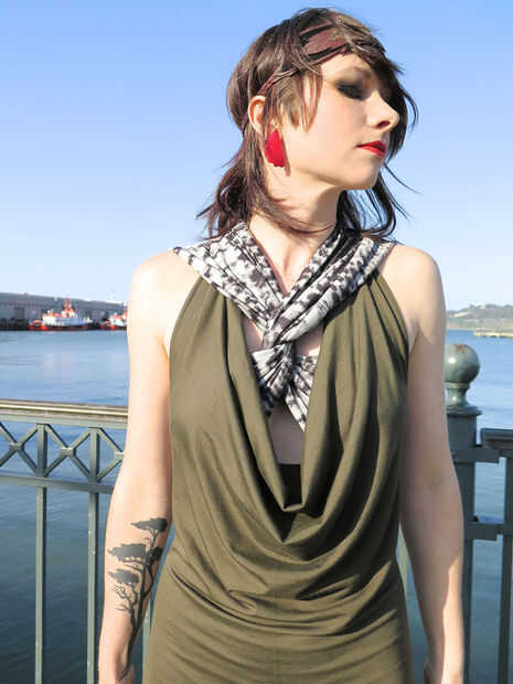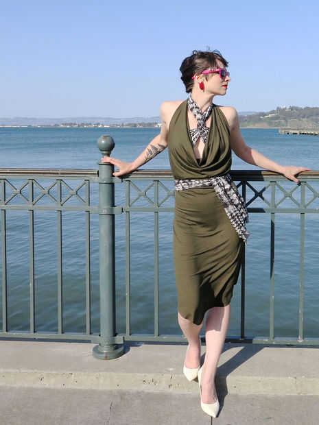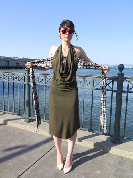 Con esto en mente, he diseñado este vestido jersey simple chimenea cuello halter a la par con una envoltura de infinito aún más sencillo que le da soporte al tiempo que también le permite usar el aspecto de muchas maneras diferentes. El estilo y el corte de este vestido y el hecho de que se puede hacer en dos telas contrastantes le da un aspecto muy diferente que el vestido usual infinito. El resultado es un sexy pero cómodo y puede ser fácilmente vestido hacia arriba o hacia abajo para diferentes ocasiones.