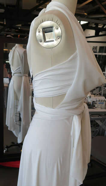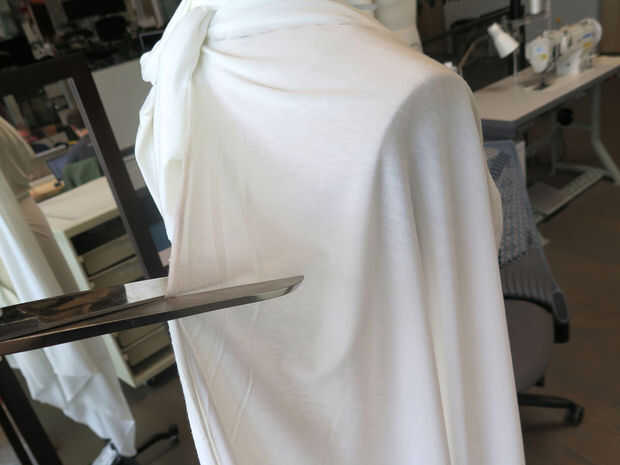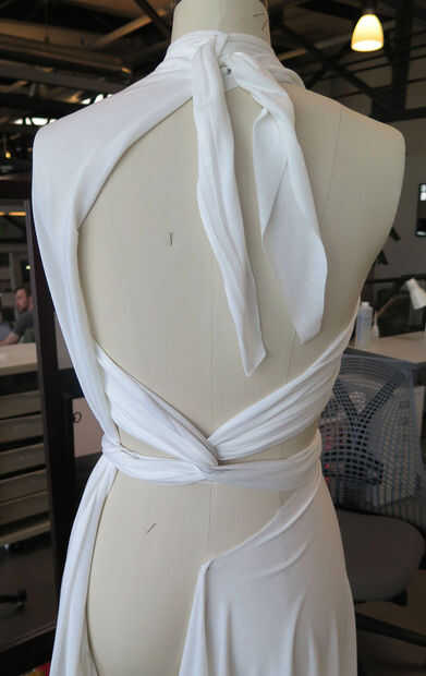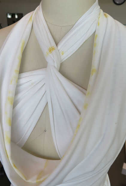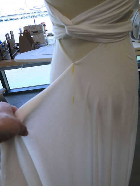Apártese y en su diseño desde todos los ángulos. ¿Cómo te gusta la manera que todo está colgando? En este punto me di cuenta de que había dibujado mi línea de estilo halter demasiado al frente y que corte a demasiado tela. Esto es cuando se puede usar el otro, lado simétrico de su diseño para modificar cualquier error que podría haber hecho en el primer lado. Te mostraré cómo hacer esto en un minuto. Pero si eres feliz con el resto de su diseño...